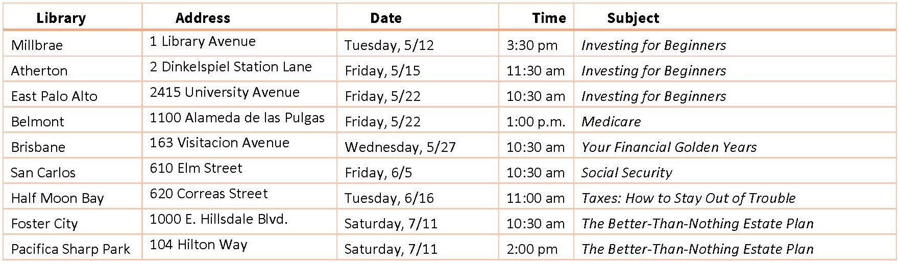 And if you prefer in-person financial literacy workshops, see below for my upcoming schedule with the San Mateo County Libraries, from May 12 to July 11, 2026